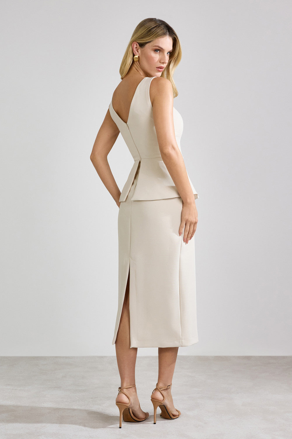 Elegância e classe definem esse vestido midi de alfaiataria, perfeito para ocasiões que pedem sofisticação. A peça possui modelagem ajustada ao corpo com recorte peplum na cintura, que valoriza a silhueta de forma discreta e refinada. O destaque fica por conta da aplicação de flor estruturada na lateral, um toque moderno e feminino que eleva o visual. Nas costas, o vestido apresenta decote "V" e fechamento por zíper invisível, além de fenda na saia que garante mobilidade e charme. Ideal para casamentos civis, eventos sociais ou produções executivas elegantes.