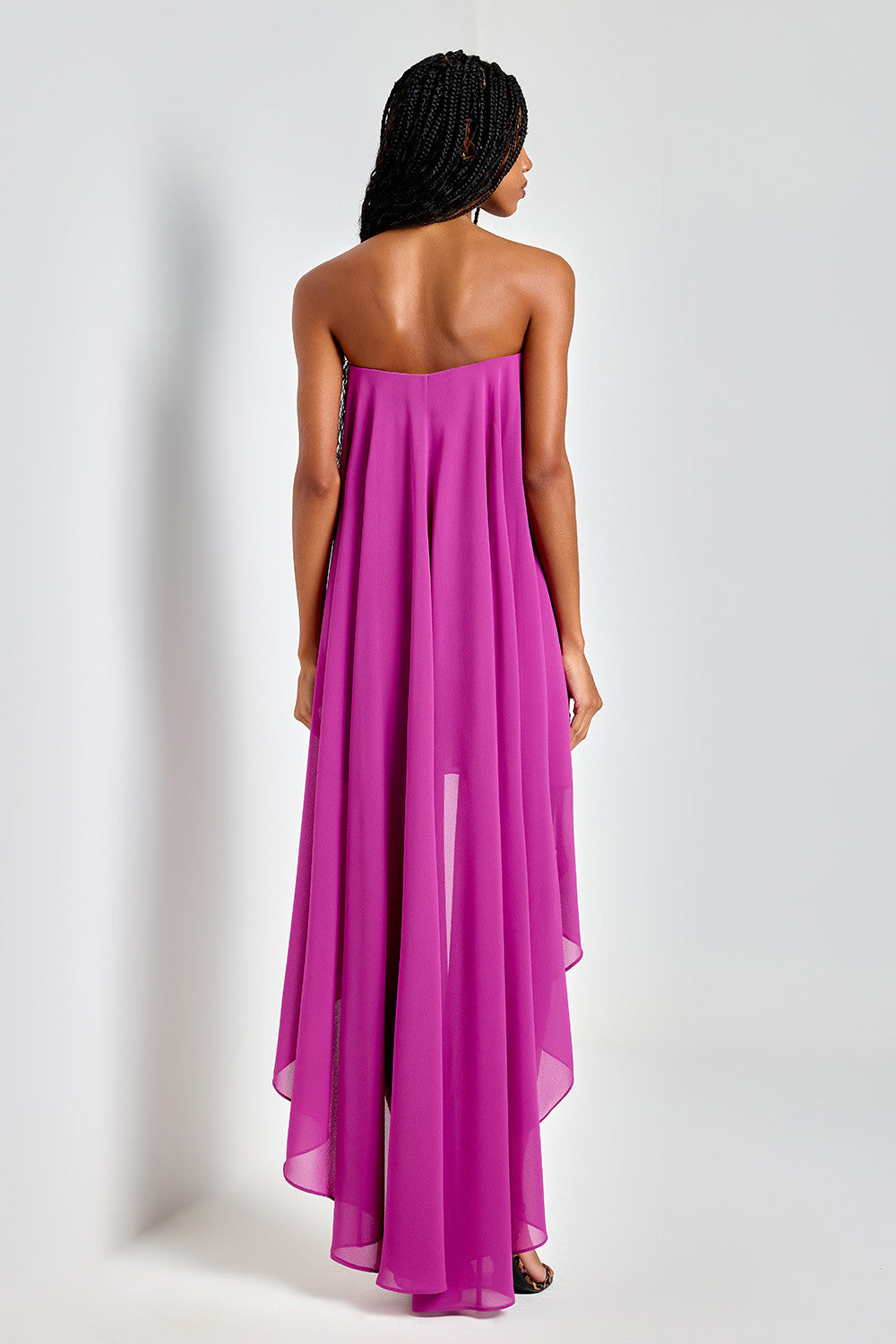 Este vestido é confeccionado em chiffon, com modelagem solta e comprimento mullet, que é curto na frente e longo nas costas. O destaque fica para o decote sem alças adornado por um laço estruturado. Uma peça versátil, perfeita para ocasiões especiais. Possui forro fixo.