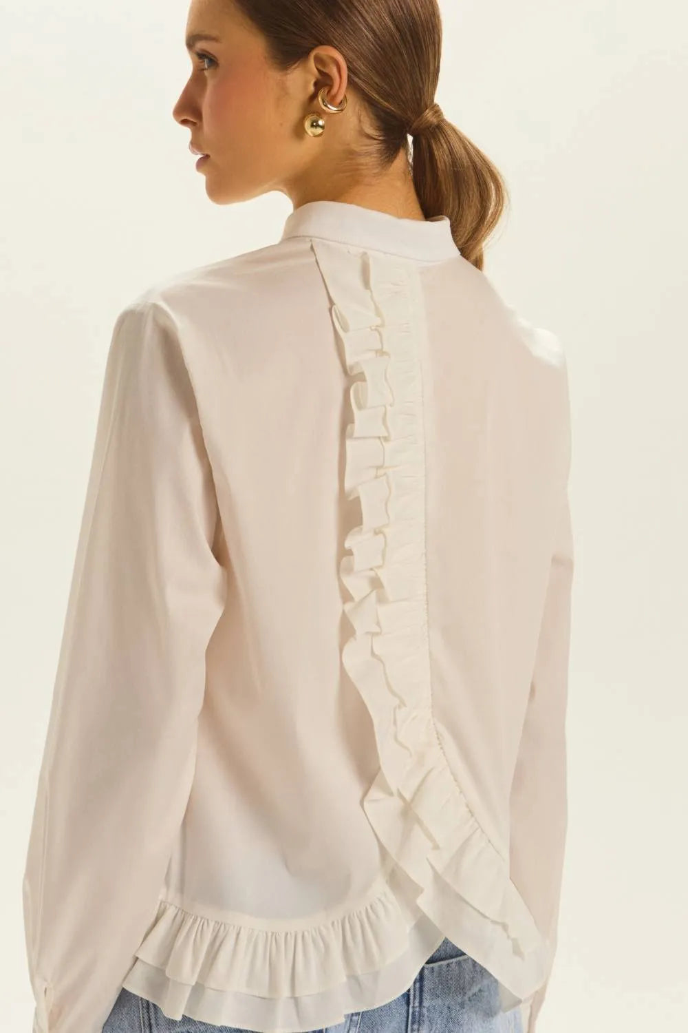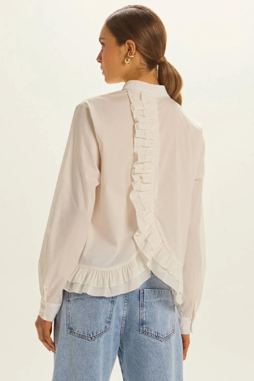A Camisa é confeccionada em tecido plano, possui caimento reto, gola com colarinho, mangas longas com abotoamento nos punhos, fechamento frontal por botões e detalhe de babados nas costas e barrado e acabamento pespontado.