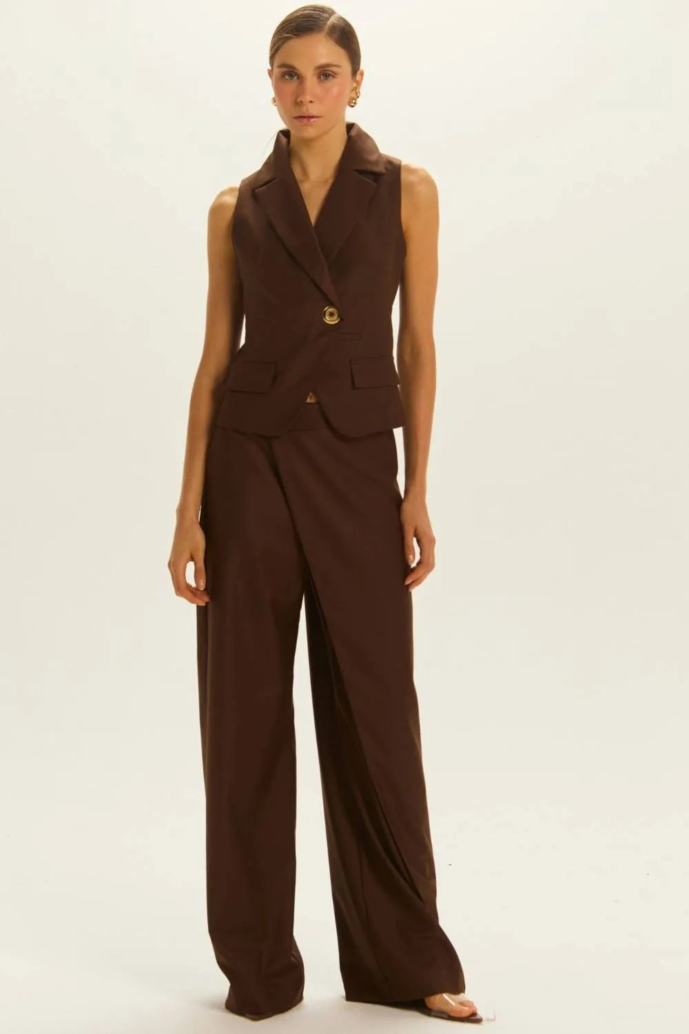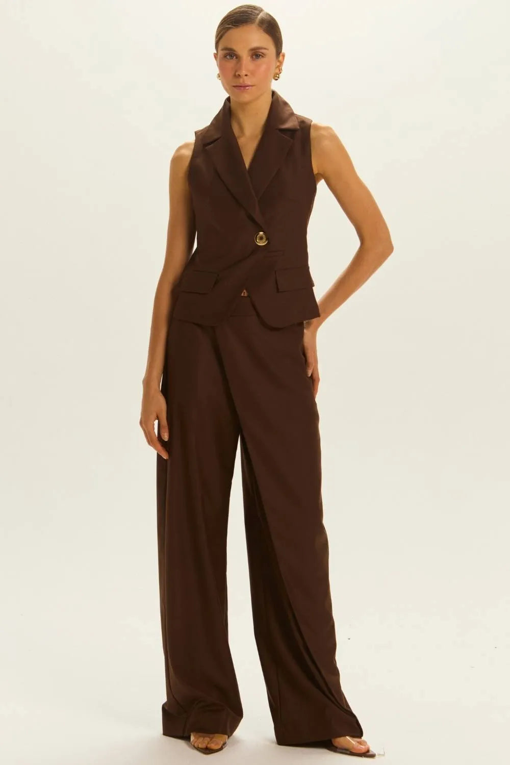 CONJUNTO PAMELA COLETE + CALÇA MARROM COFFEE