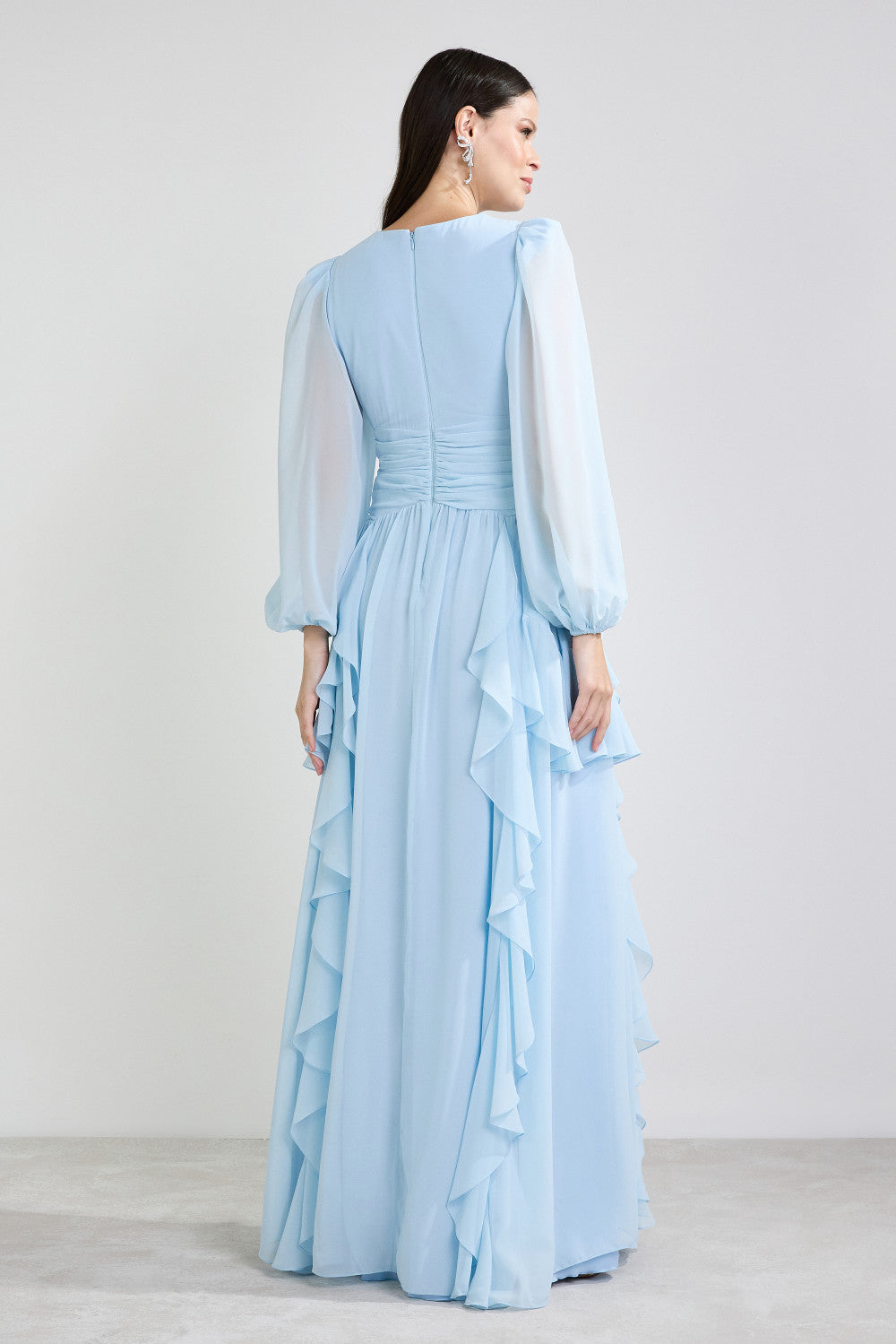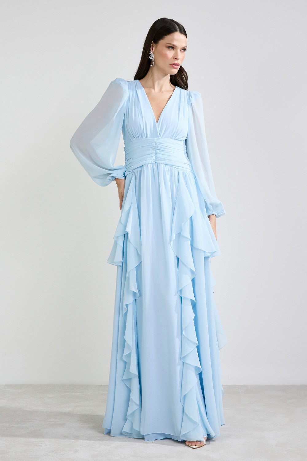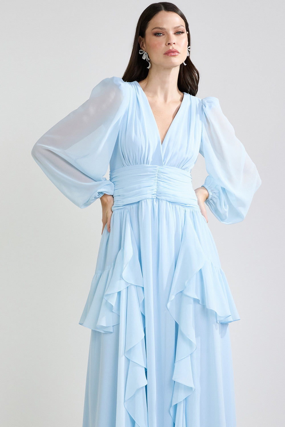 Vestido Drapeado Harmony possui decote V transpassado, manga longa, pala drapeada, saia evasê com um lindo babado cascata e forro preso à peça. Confeccionado em Chiffon toque de seda, com leve transparência, com toque que proporciona sedosidade e maciez. O destaque do vestido é o drapeado na cintura, que cria uma silhueta alongada que confere movimento e um ar dramático, ideal para casamentos, formaturas e celebrações.