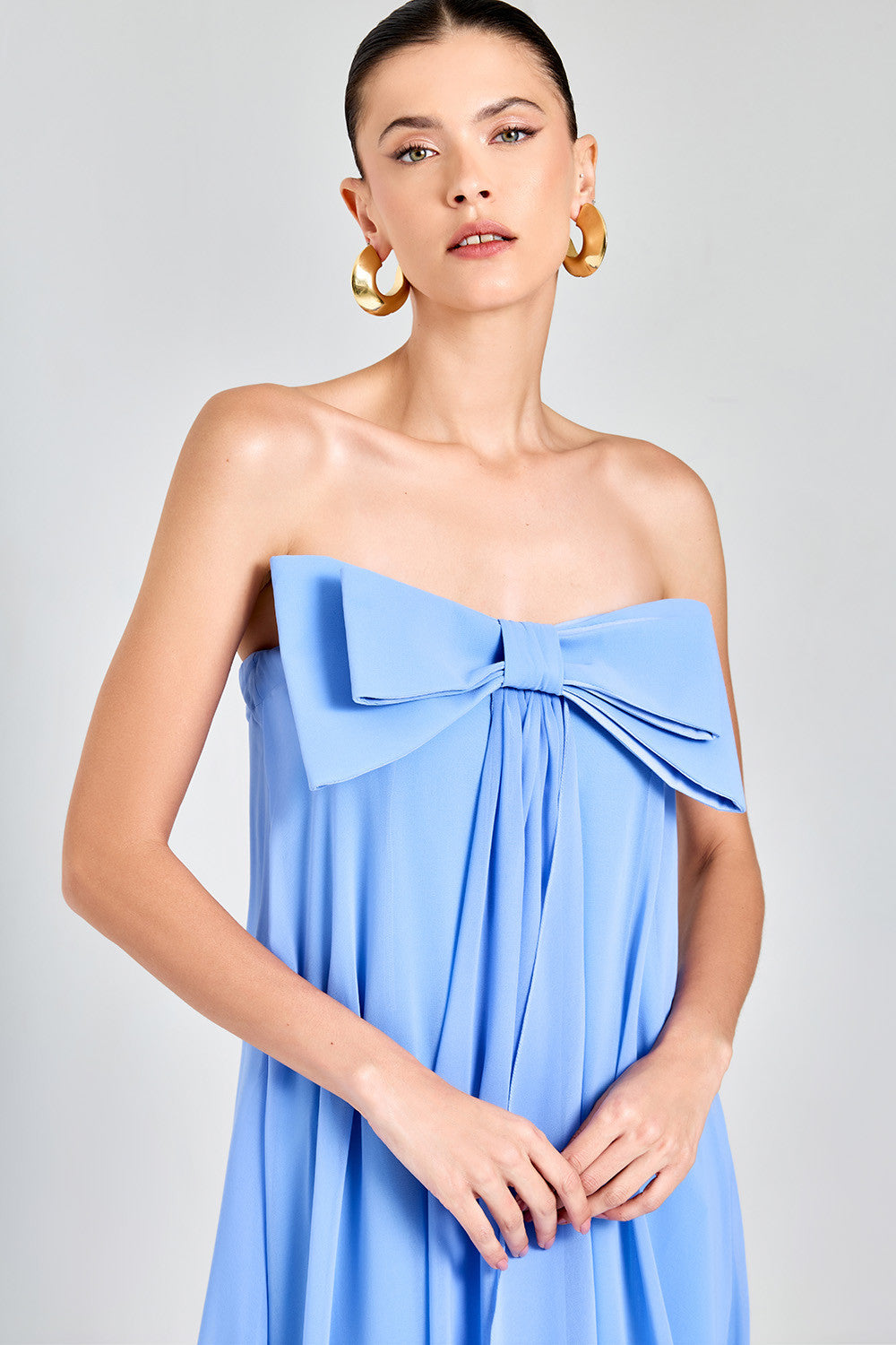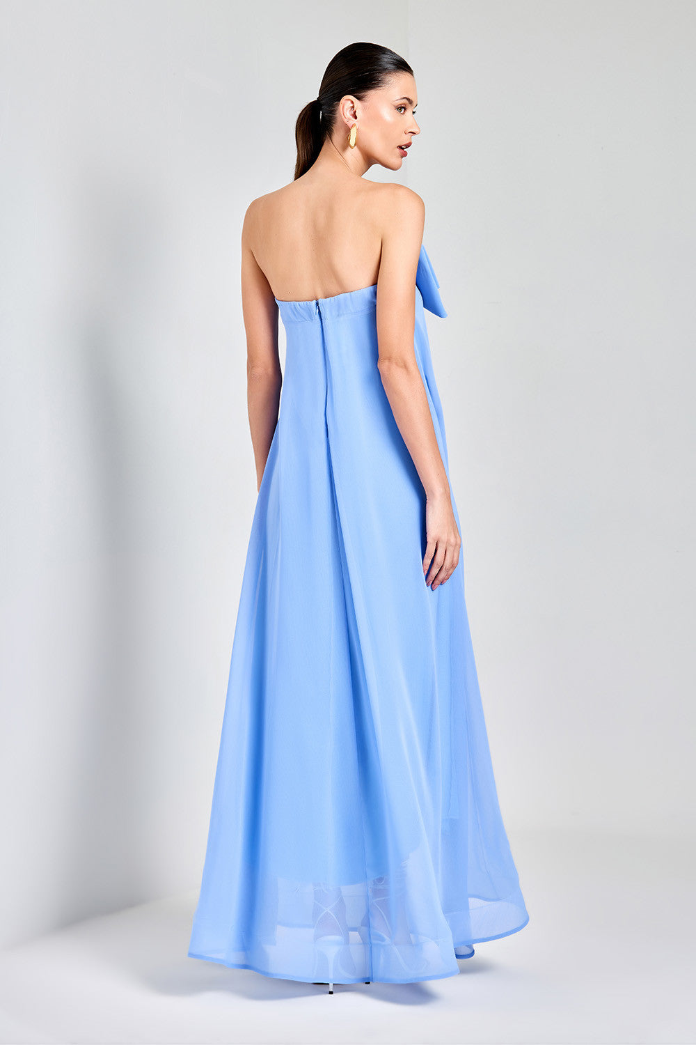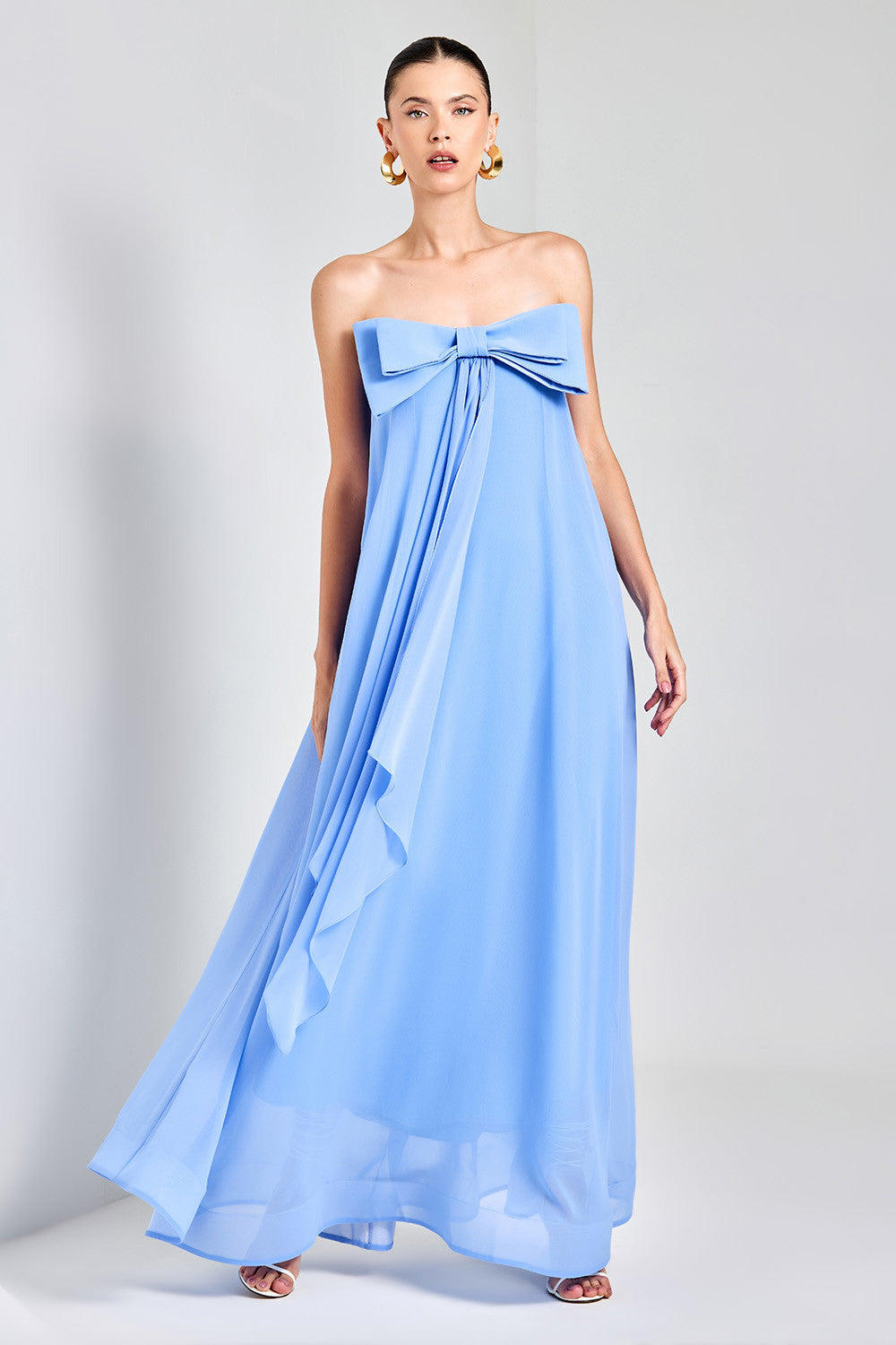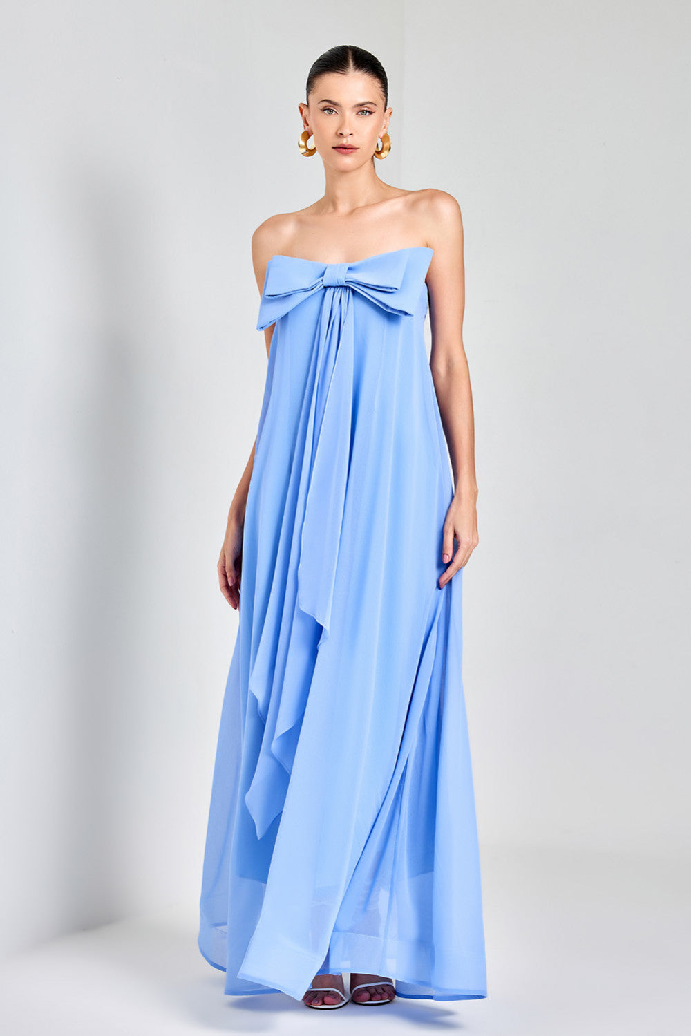 Vestido longo, possui elegante decote tomara que caia, adornado com um delicado laço duplo e cascata de tecido frontal que acrescenta um toque de sofisticação à peça. Sua modelagem soltinha oferece conforto incomparável, permitindo que você se sinta à vontade em qualquer ocasião. Confeccionado em tecido com toque de seda, proporciona uma sensação suave e confortável ao toque. Combine com sandálias elegantes e acessórios para criar um visual deslumbrante.