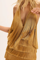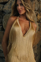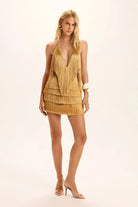 O Macaquinho Paula é em linho com modelagem frente única e amarração no pescoço, trazendo decote profundo em V que valoriza a silhueta. A aplicação de aviamento de franjas em camadas acompanha a modelagem da peça, na frente e nas costas, criando movimento e sofisticação.Leveza e movimento em cada detalhe.