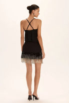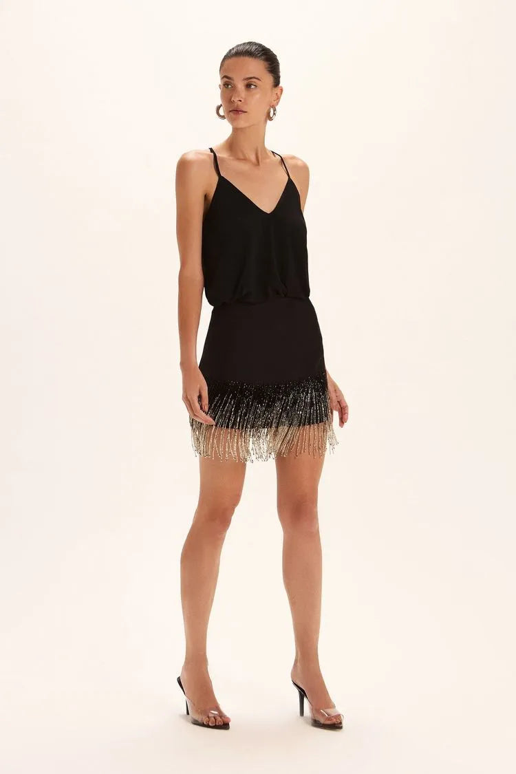 A Saia Bruna é mini, forrada e de cintura alta, trazendo conforto e sofisticação. A peça especial apresenta bordado manual localizado na frente, em franjas degradê com mix de vidrilhos em preto, ônix e prata — 100% bordado à mão, resultando em um acabamento único e cheio de personalidade.Detalhes que brilham a cada movimento.