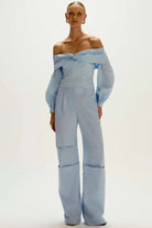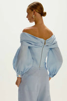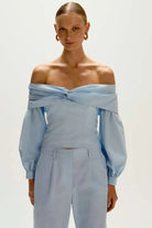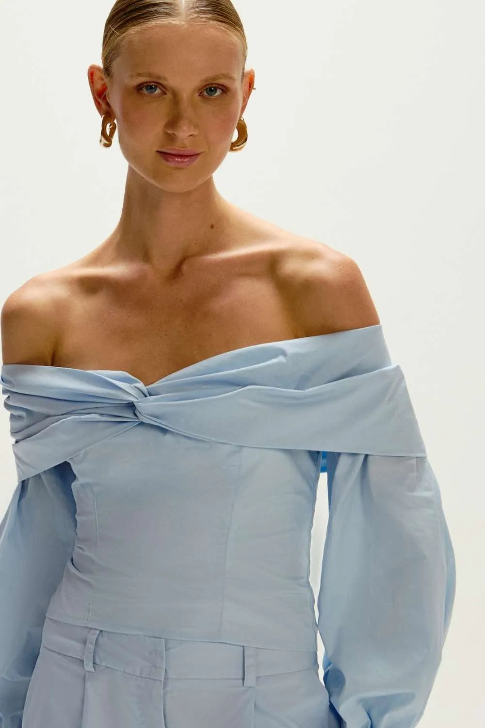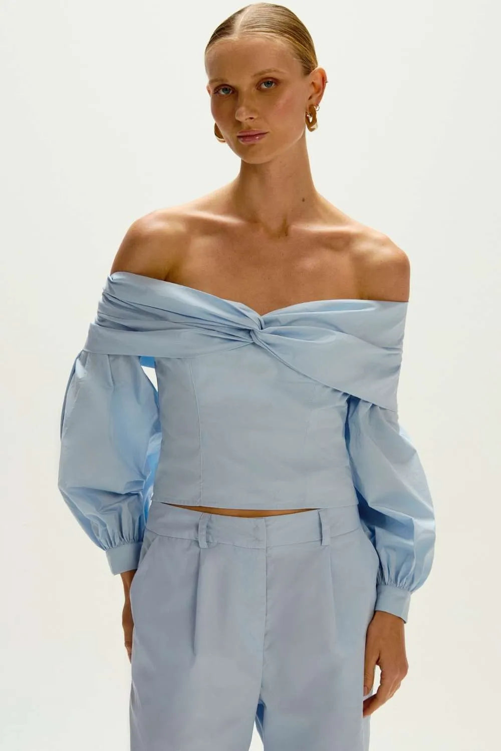A Blusa é confeccionada em algodão, possui caimento justo, modelo off shoulder, decote reto com detalhe torcido, mangas 3/4 levemente bufantes, fechamento por zíper e acabamento premium."