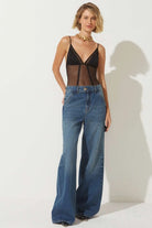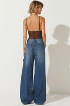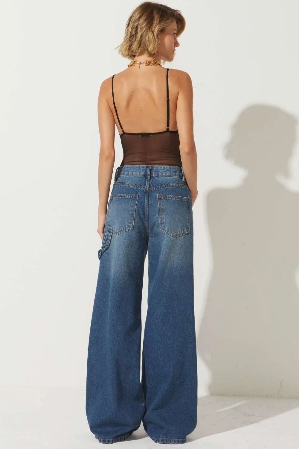 A Calça Cris é confeccionada em jeans de lavagem média, possui modelagem wide, cós com passantes, fechamento frontal por zíper e botão, bolso faca e acabamento pespontado.