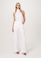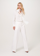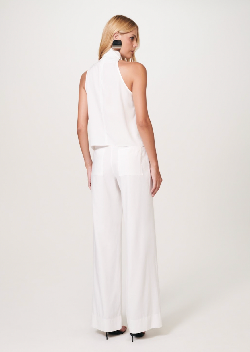 Calça de alfaiataria de viscose reta, com cós transpassado, lapela de bolso na frente, bolsos traseiros e nervura na frente.
