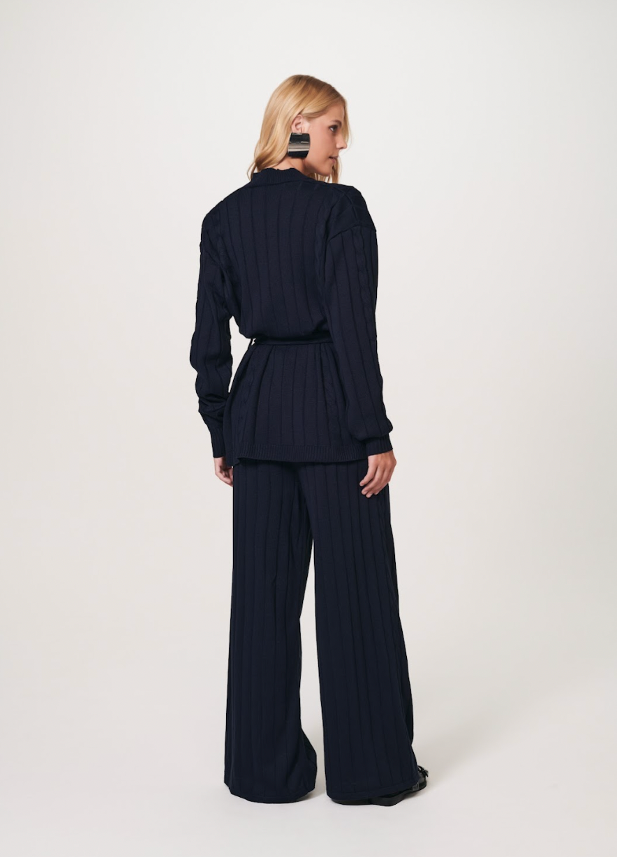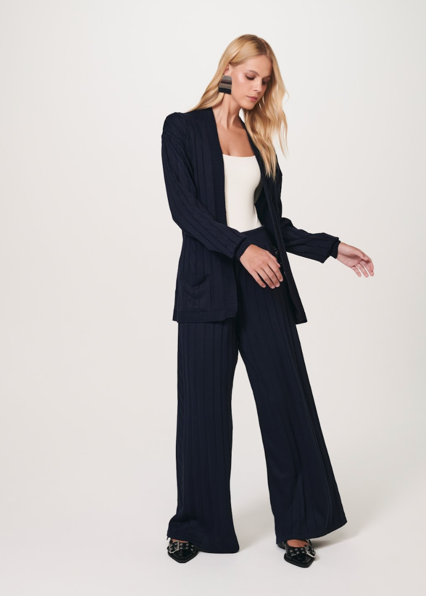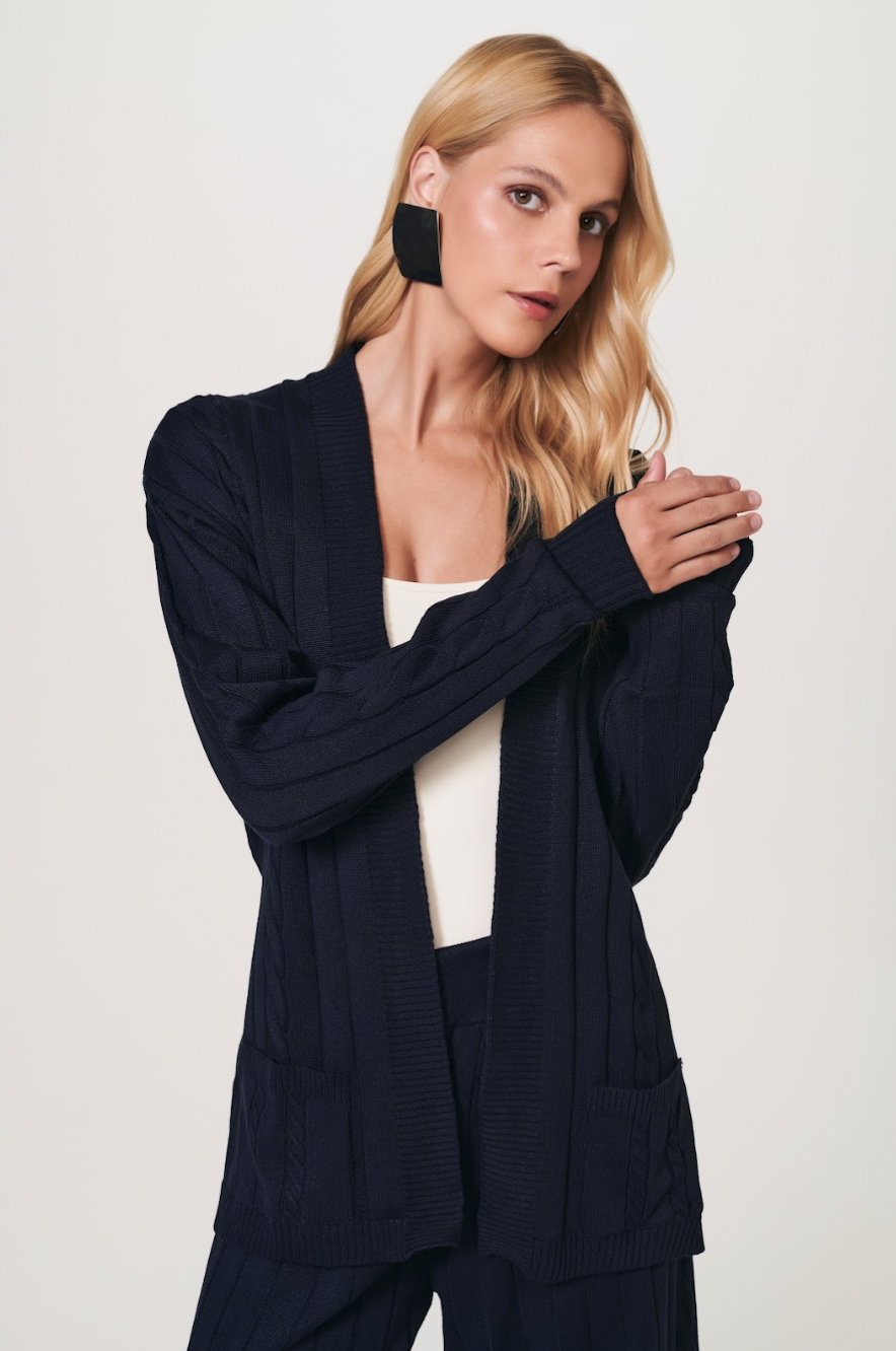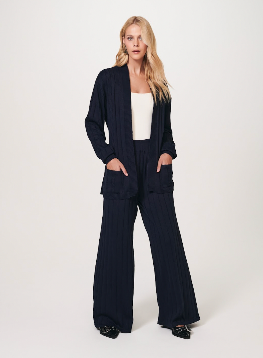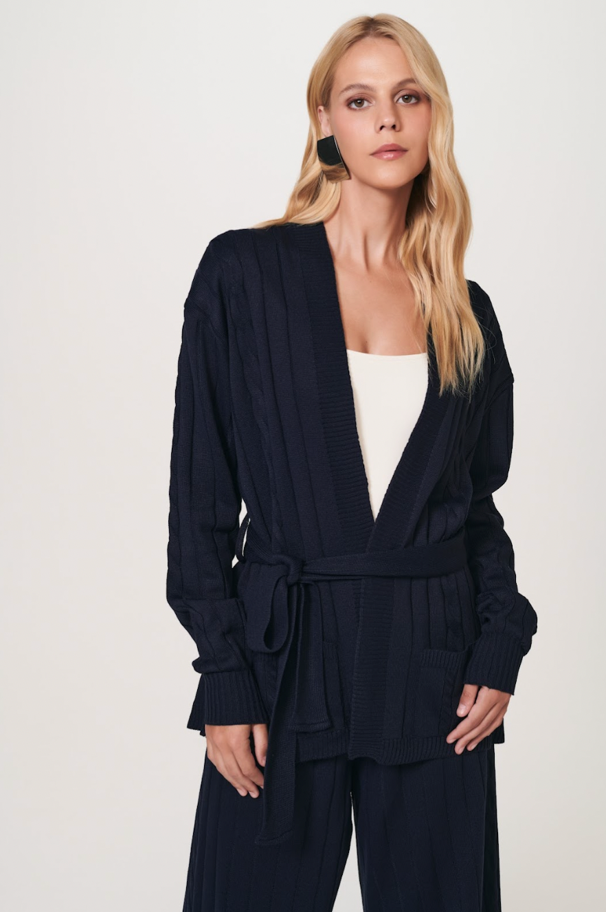 Cardigan de tricot canelado e trançado, com bolsos e acompanha faixa. Calça de tricot canelado e trançado, com de elástico.