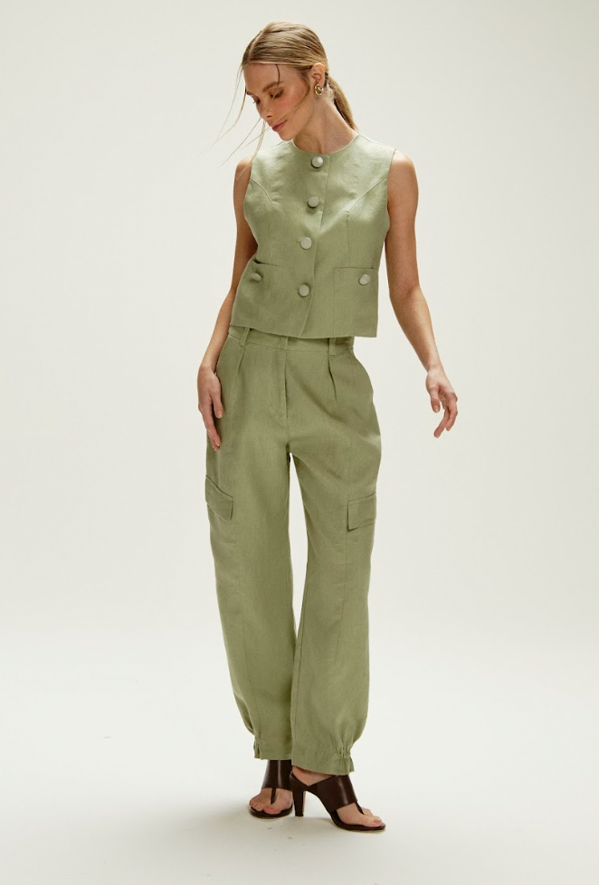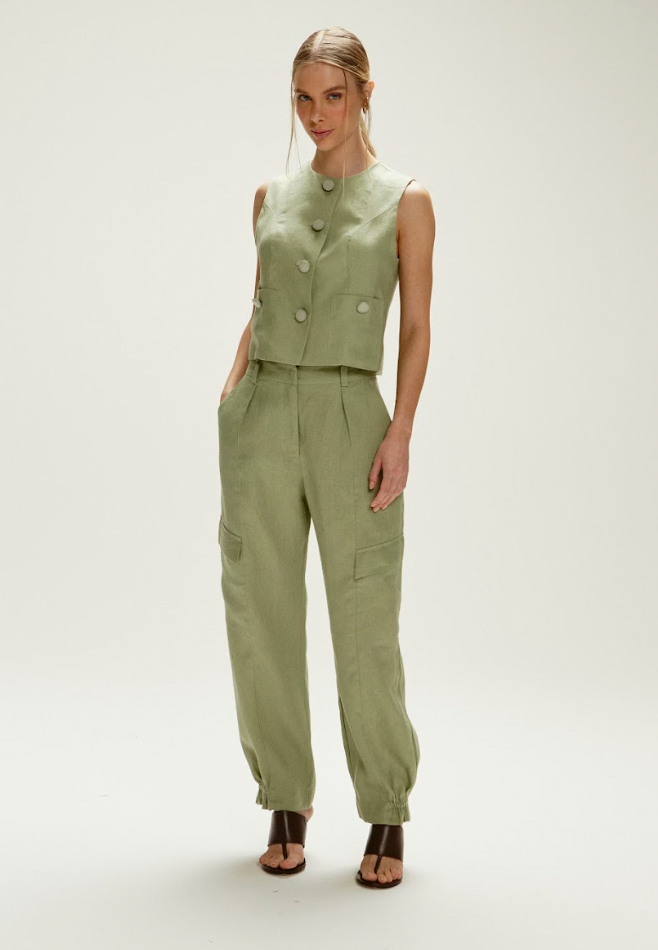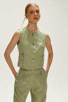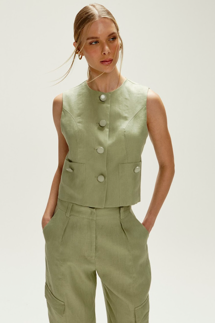 O colete sem manga oferece um corte refinado com botões frontais, ideal para diversas composições.