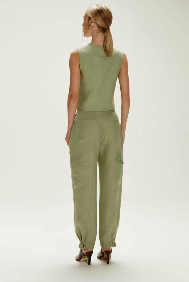 A calça estilo alfaiataria se destaca pelo corte impecável e o detalhe moderno no punho. Sua modelagem proporciona caimento fluído e sofisticação, com bolsos cargo que adicionam um toque contemporâneo e funcionalidade.