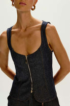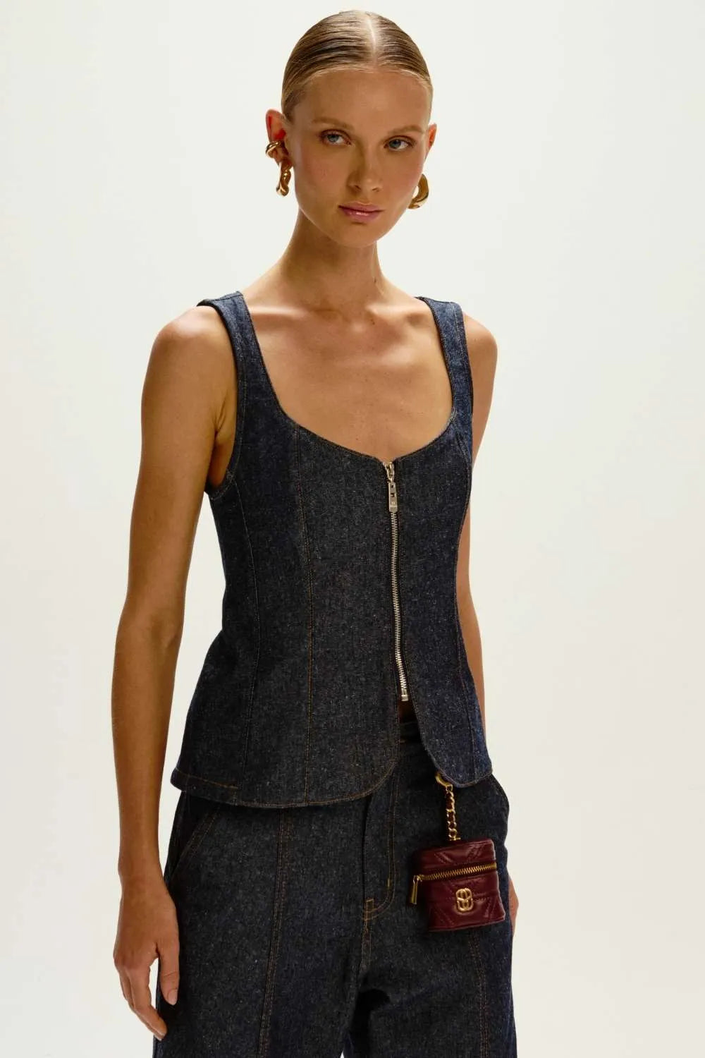 A Blusa jeans Lara é confeccionado em jeans, possui modelagem justa, decote em ""U"", alças médias, fechamento frontal por zíper, e acabamento pespontado.