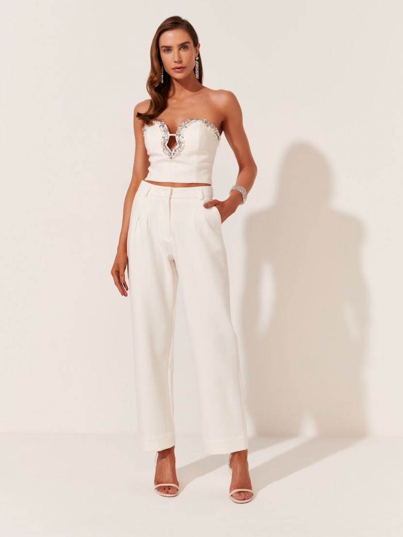 Corselet sem alças em Alfaiataria Bordado Handmade, decote diferenciado, busto ajustado, fechamento traseiro por zíper de metal, aplicação de bordados em mix de cristais, pérolas e joias.
