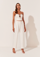 Calça em Alfaiataria Bordado Handmade, com pregas frontais, bolsos laterais e traseiros, barra larga.