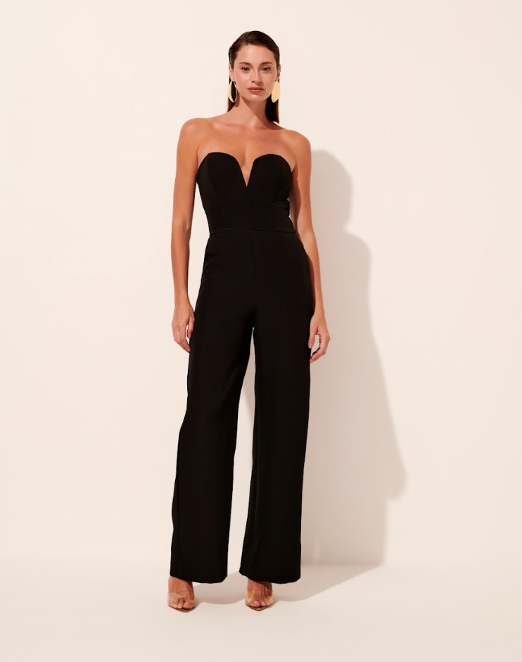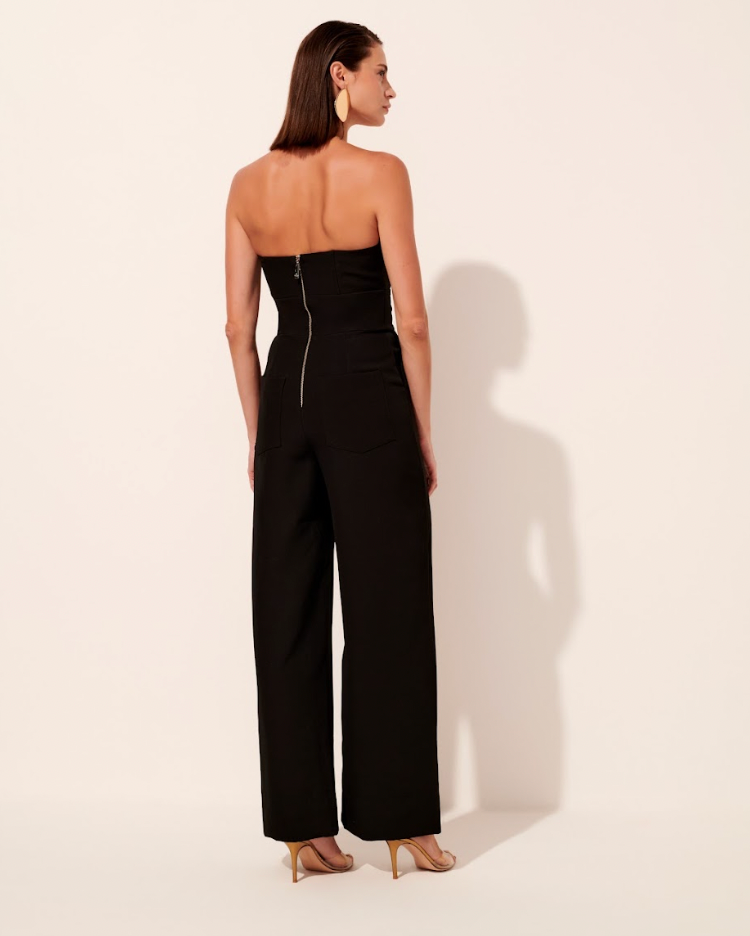 Macacão bicolor em alfaiataria com elastano com decote estruturado sem alças. Fechamento posterior por zíper.
