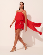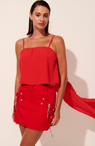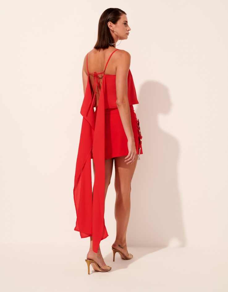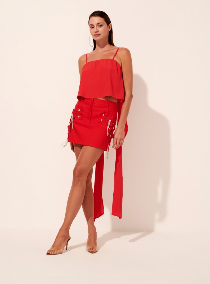 Saia curta em alfaiataria de algodão com bordado manual de flores cortadas à laser com fios de strass, possui cós com passante duplo e fechamento frontal por colchete e zíper.