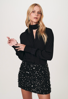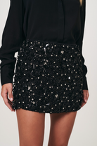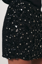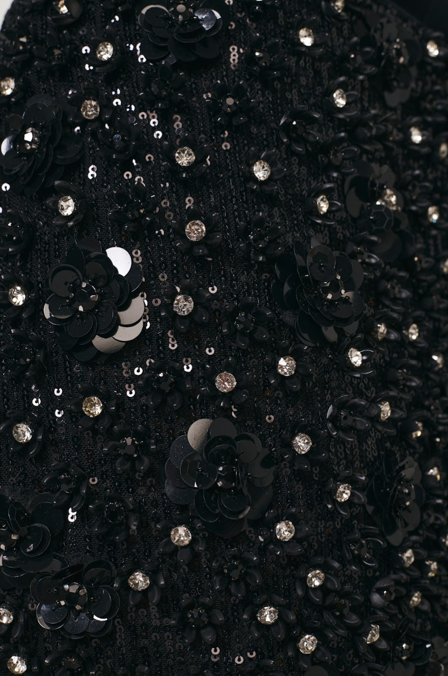 Saia curta de paetê preto brilhante, fechamento por zíper de metal na lateral, forro interno, com aplicação de bordado 100% manual 3D de flores de paetê e mix de pedras.