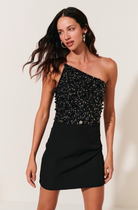 O VESTIDO AMORA é confeccionado em ALFAIATARIA, possui decote assimétrico, pedrarias aplicadas 100% MANUAL, comprimento curto e acabamento premium.