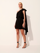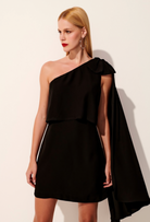 Vestido curto em crepe 100% viscose um ombro só com laço e faixa esvoaçante tipo "capa", blusa sobreposta á saia.