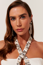 Vestido midi frente única em Alfaiataria Bordado Handmade, com recorte cut-out central, decote gota, fenda traseira, fechamento top e saia por zíper de metal traseiro, aplicação de bordados em mix de cristais, pérolas, búzios em níquel e joias.