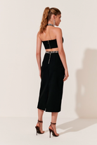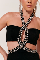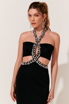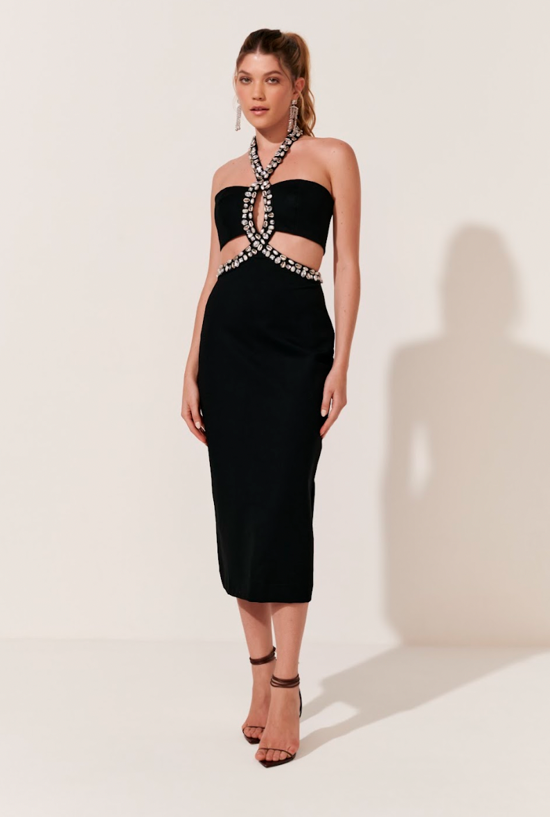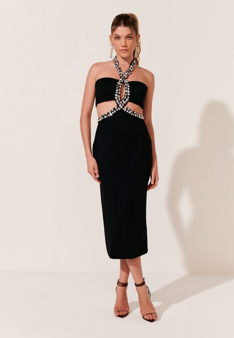 Vestido midi frente única em Alfaiataria Bordado Handmade, com recorte cut-out central, decote gota, fenda traseira, fechamento top e saia por zíper de metal traseiro, aplicação de bordados em mix de cristais, pérolas, búzios em níquel e joias.