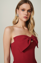 O Vestido Tânia é confeccionado em tecido plano, possui modelagem de alfaiataria possui modelo tomara que caia com detalhe de laço, e decote coração para maior sustentação, fechamento posterior por zíper.