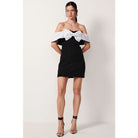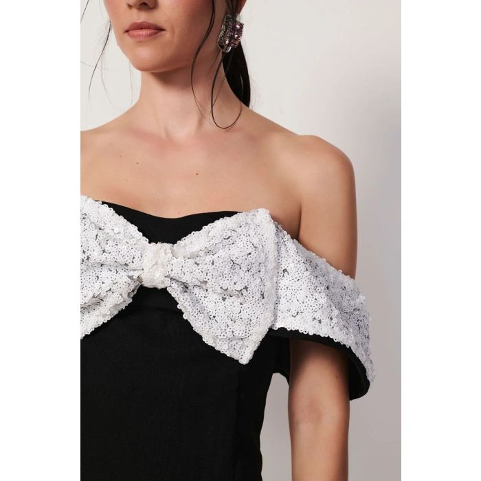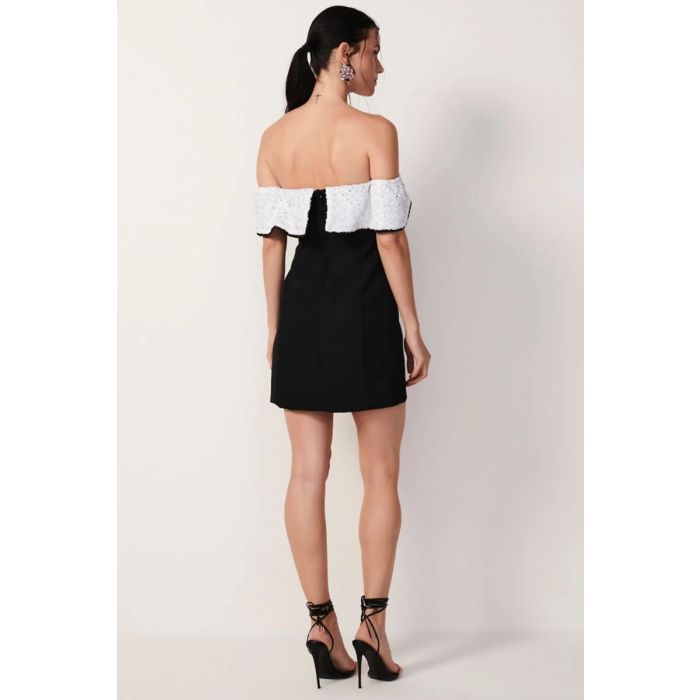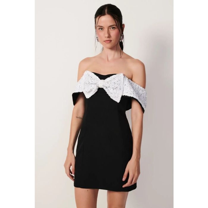 Vestido preto com branco de comprimento curto confeccionado em alfaiataria (96% Poliéster e 4% Elastano). Leva filhete de silicone interno à circunferência do busto, pala sobreposta bordada em paetês, corpo acinturado, barra arredondada e fechamento por zíper nas costas.