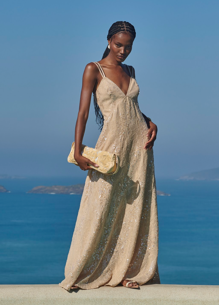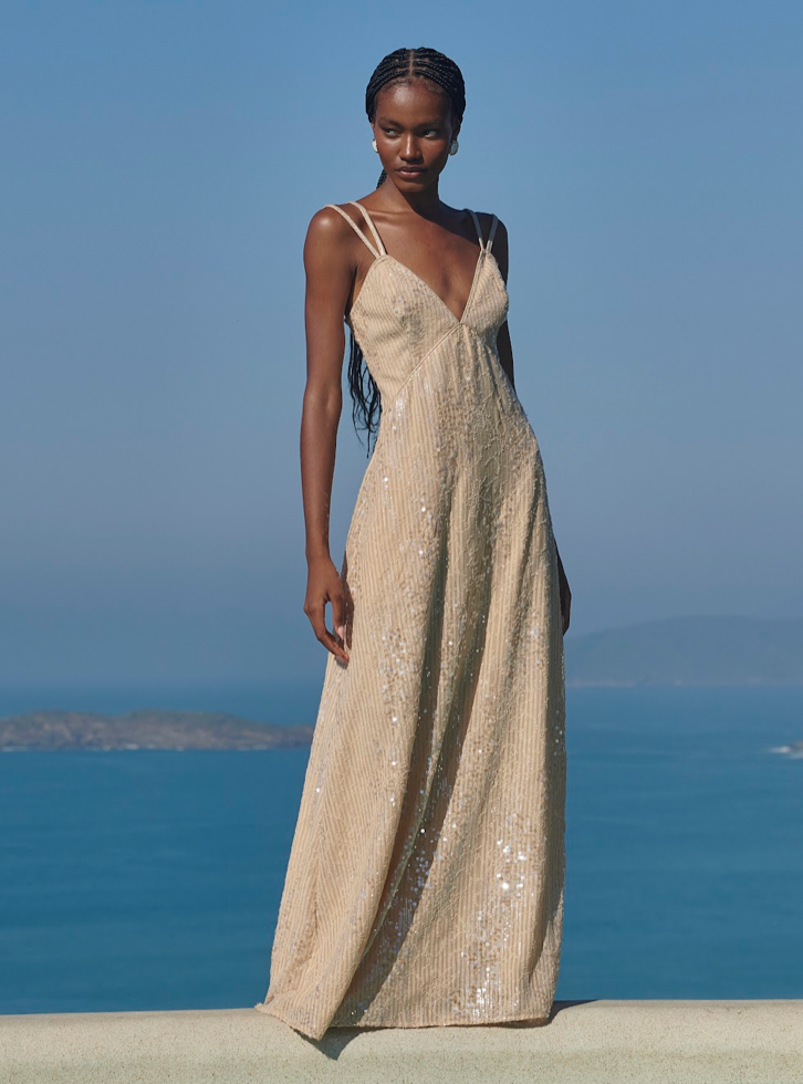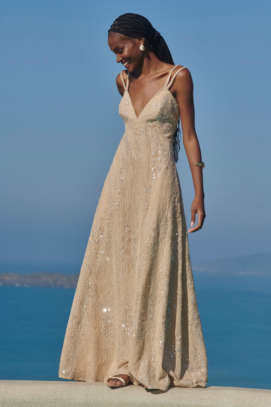 Vestido longo completamente bordado com um mix de paetês reluzentes. Alças duplas. Fechamento em zíper nas costas.