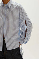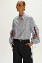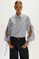 A Camisa listrada úrsula é confeccionada em algodão, possui padronagem listrada, gola com colarinho, mangas longas com tiras nos punhos, fechamento frontal por botões e detalhe de abertura nas mangas, cordão para amarração e acabamento pespontado.