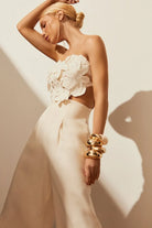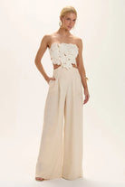 Com modelagem pantalona e recorte vazado na cintura, o Macacão Tássia une elegância moderna e atitude. Sem alças, valoriza o colo e os ombros, enquanto o top ganha destaque com aviamento em fios especiais e bordado aplicado com técnica exclusiva. As flores e patches com efeito 3D criam uma composição única e artesanal, transformando a peça em um verdadeiro ícone de estilo.