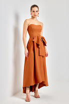 Vestido Mullet elegante com decote sem alça e caimento sofisticado, destacando o colo. O detalhe de laço na cintura adiciona um toque romântico e ajuda a acentuar a silhueta. O comprimento mullet proporciona um visual moderno, com a parte da frente mais curta e a parte de trás alongada, criando movimento e fluidez ao caminhar. Ideal para eventos formais, casamentos e festas, o vestido garante um look sofisticado e contemporâneo. Combine com sandálias delicadas e acessórios discretos para completar o visual.