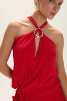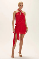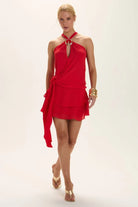 O Vestido Lígia apresenta decote com detalhe metal gota dourado e transpasse frontal com amarração, enquanto as costas ganham decote profundo com ajustador para um caimento perfeito. A saia curta vem com babado duplo e forro tipo shortinho, garantindo conforto e movimento. Fechamento com zíper invisível lateral completa a peça, confeccionada em tecido leve de viscose que valoriza a silhueta com fluidez.