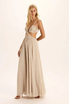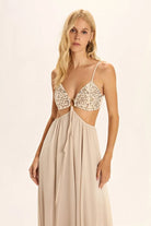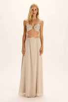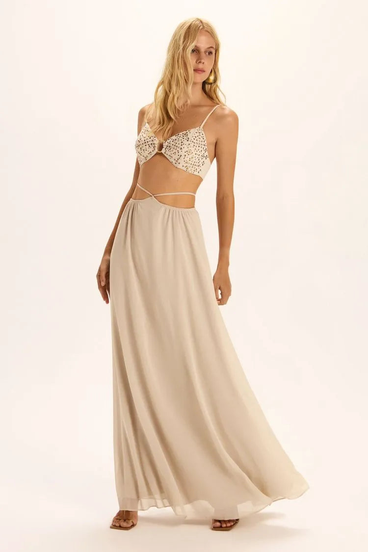 Vestido 2 em 1 que permite múltiplas composições. A proposta completa traz a saia longa fluida, com tecido duplo e movimento leve, unida ao top por uma tira de amarração delicada. O top recebe aplicação de Hot Fix com desenho exclusivo, combinando cristais e chapinhas de metal em um mix refinado que traz brilho na medida.Versatilidade elevada ao glam.