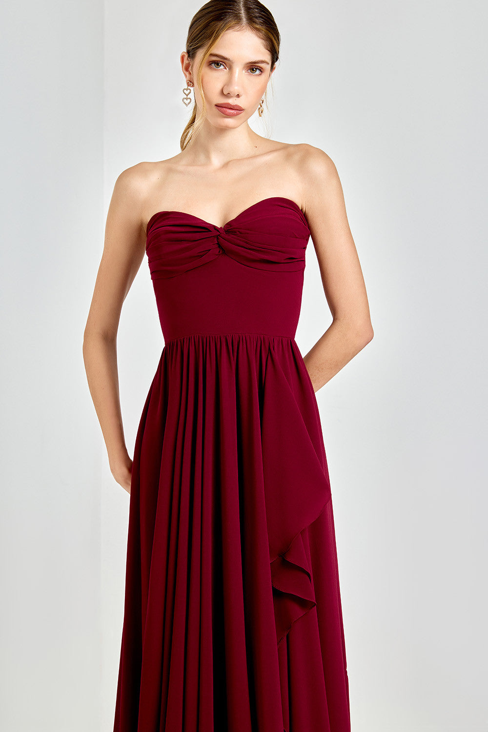Vestido longo de chiffon com busto coração com torção. O modelo possui modelagem acinturada e saia ampla com babados verticais que se abrem em uma fenda. Perfeito para casamentos, festas e diversos outros momentos especiais.