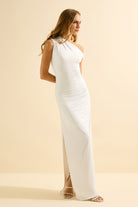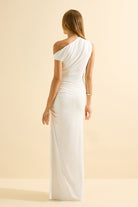 Vestido longo em malha, modelo de um ombro só, que traz modernidade e sofisticação. A parte frontal possui drapeados estratégicos que valorizam a silhueta, além de fenda discreta na barra para maior conforto ao caminhar. O caimento ajustado destaca as curvas de forma elegante. Nas costas, o vestido mantém o mesmo efeito drapeado, com decote assimétrico que acompanha o design de um ombro só. A modelagem alongada garante um visual sofisticado, ideal para eventos formais e ocasiões especiais.