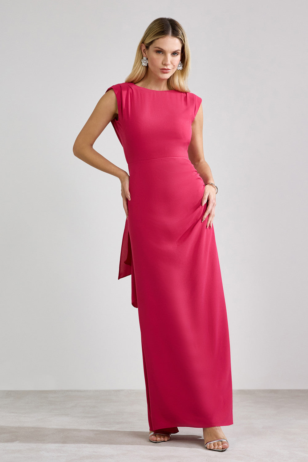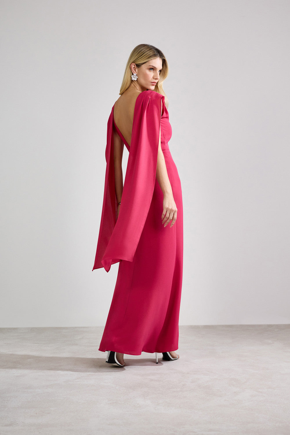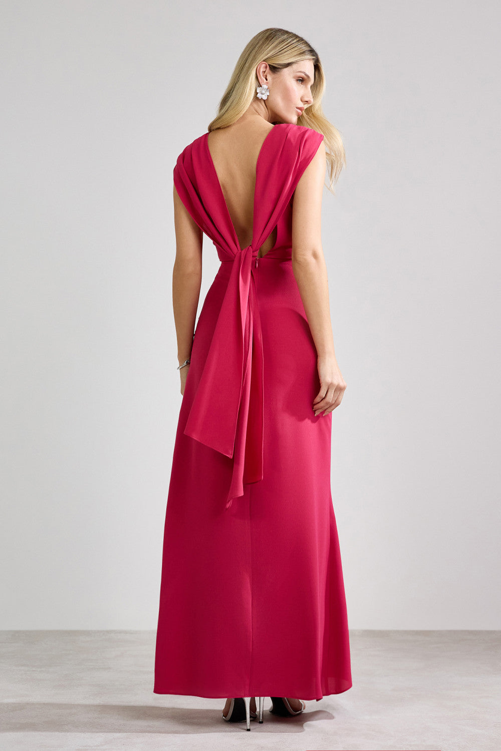 Vestido longo, confeccionado em tecido leve e fluído que proporciona excelente caimento. Possui modelagem reta e elegante, com decote fechado na parte da frente e detalhe de recorte na cintura que valoriza a silhueta. Destaque para as ombreiras discretas que conferem estrutura e sofisticação à peça. Nas costas, o modelo surpreende com um decote profundo e aplicação de laço no mesmo tecido, adicionando charme e feminilidade. O detalhe do laço permite ajuste e melhor acomodação da peça no corpo. O comprimento longo garante um visual imponente e perfeito para ocasiões especiais como festas, casamentos e eventos noturnos.