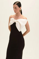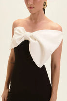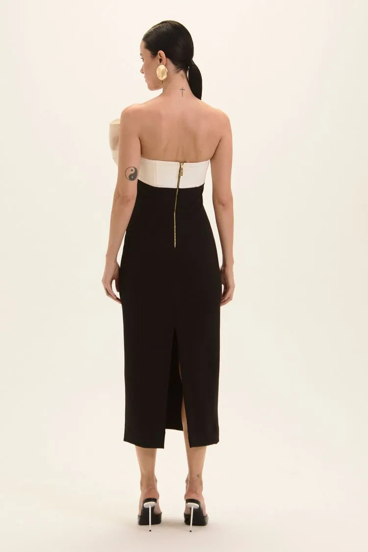 O Vestido Midi Lana combina sofisticação e impacto em uma proposta atemporal. Em contraste P&B e alfaiataria estruturada, ele valoriza a silhueta com linhas limpas e presença elegante. O decote é finalizado com faixa em off que forma o efeito de maxi laço na altura do busto detalhe protagonista que traz charme e personalidade. A fenda nas costas adiciona movimento e leveza ao caminhar, equilibrando o visual com sutileza.