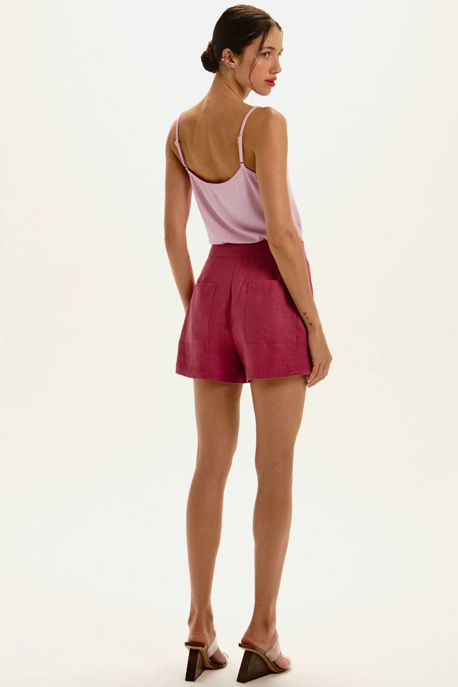 O Shorts Saia é confeccionado em linho, possui modelagem alfaiataria, detalhe de transpasse frontal, dois bolsos posteriores, comprimento curto e acabamento pespontado.