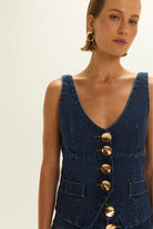 Confeccionado em jeans, o colete apresenta modelagem levemente acinturada e comprimento na altura do quadril. Possui decote em V e fechamento frontal por botões. Não possui mangas nem bolsos aparentes.