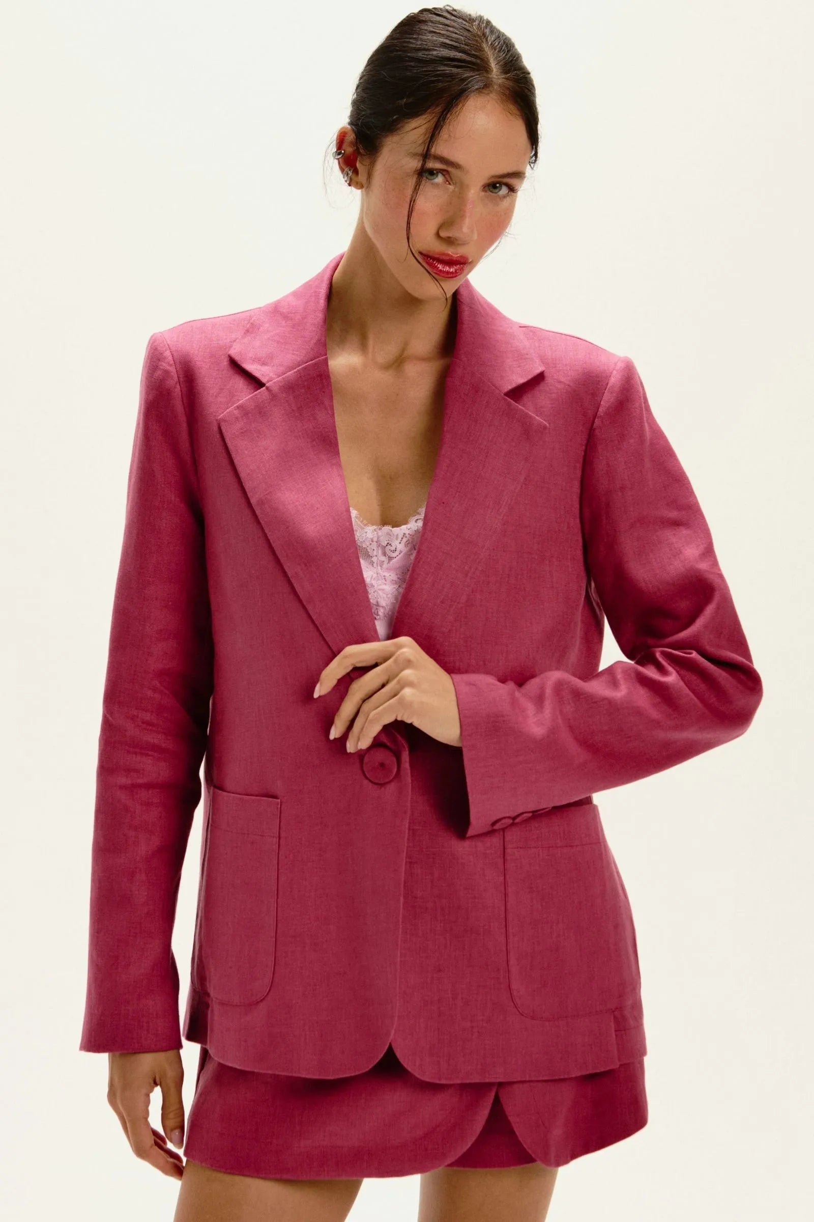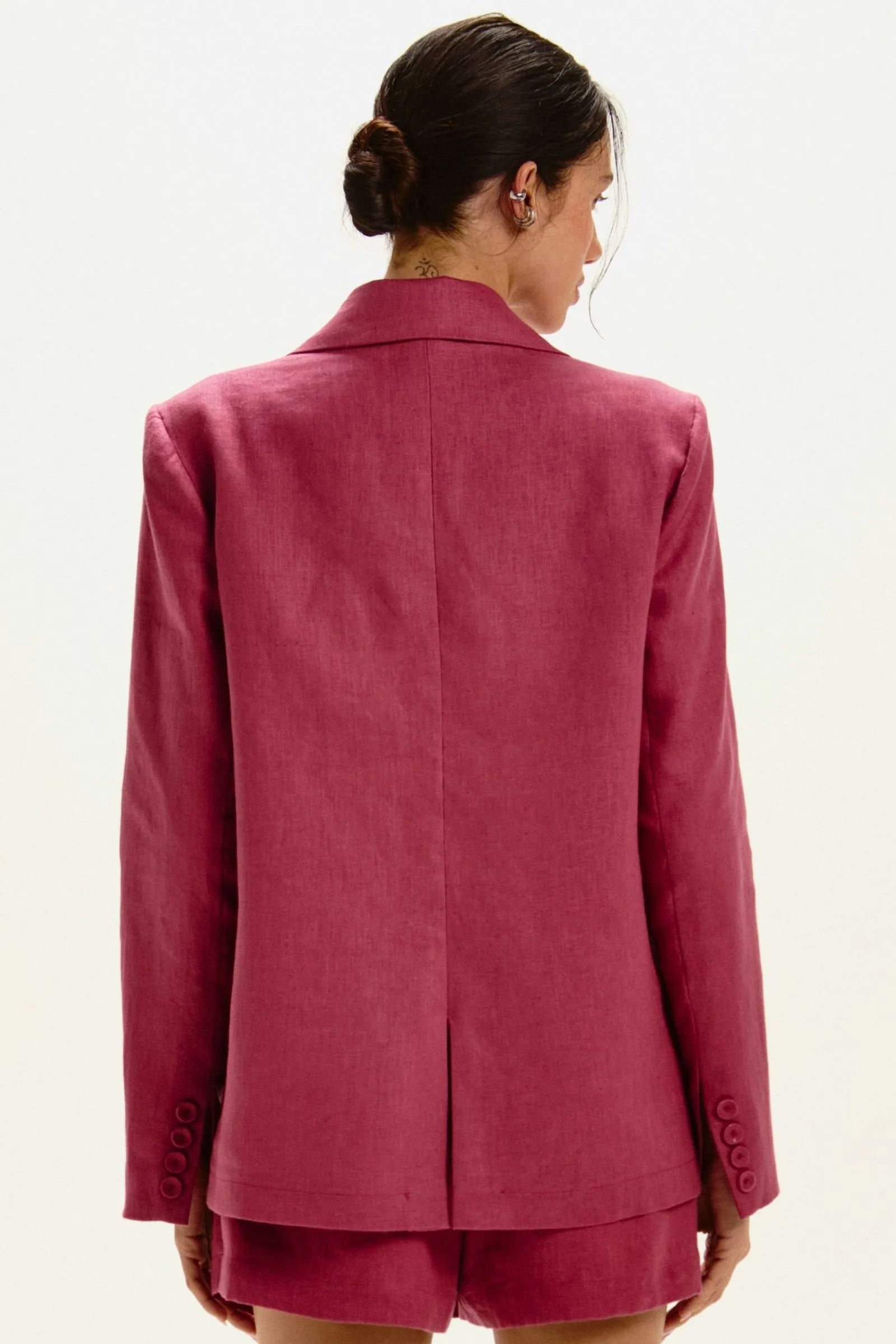 O Blazer Alice é confeccionado em linho com modelagem alfaiataria, possui caimento reto, lapelas peaked, mangas longas, fechamento frontal por botão, lapelas frontais, fenda traseira e forro embutido.