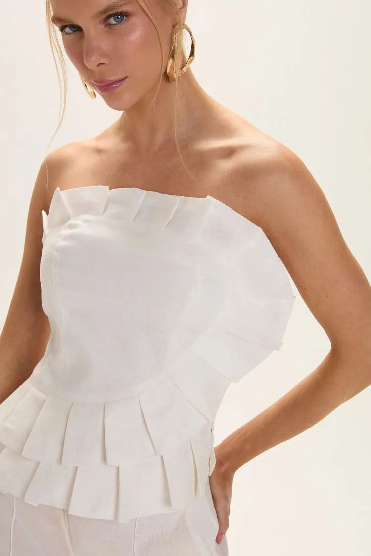O Corselet Suzie, confeccionado em 100% linho, apresenta modelagem sem mangas com babado duplo em pregas, unindo romantismo e atitude. As costas ganham destaque com detalhe peplum, que valoriza a silhueta e adiciona movimento à peça. O fechamento lateral com zíper invisível garante um acabamento sofisticado e impecável.